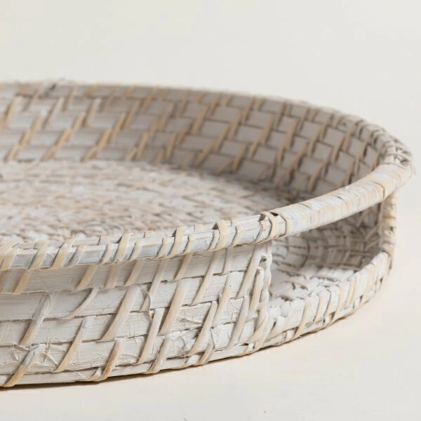 BANDEJA REDONDA REALIZADA EN BAMBU Y RATAN EN COLOR BLANCO. SU DISEÑO CUENTA CON ASAS PARA MEJOR AGARRE. .