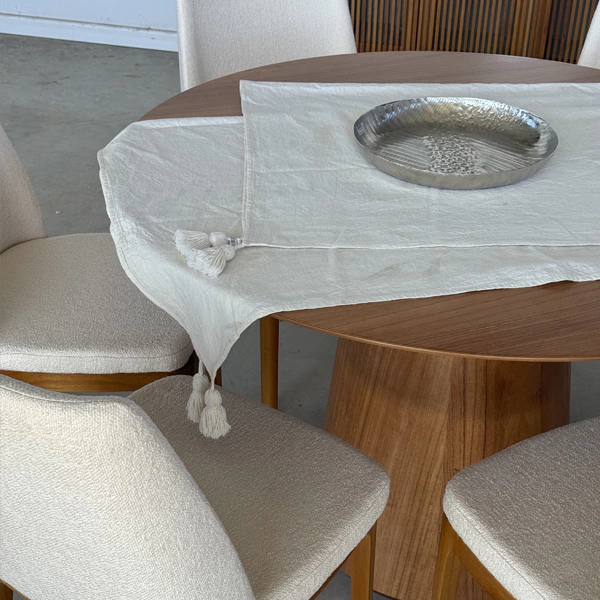 La mesa Zara Redonda se distingue por su base cónica de madera paraiso, que le aporta calidez y personalidad. Su diseño combina materiales de calidad con detalles que realzan la estética y aseguran durabilidad.