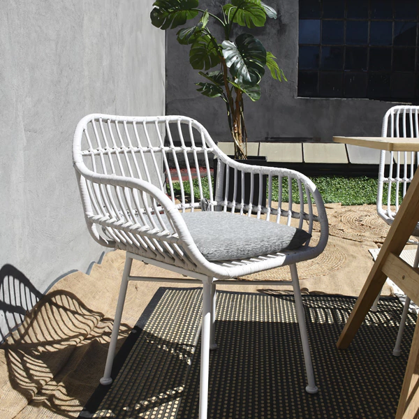 La silla Kenia une funcionalidad y diseño con su estructura metálica pintada al horno y su asiento tramado en ratán sintético, ideal para sumar calidez y frescura a tus espacios. Liviana, fácil de limpiar y súper versátil.